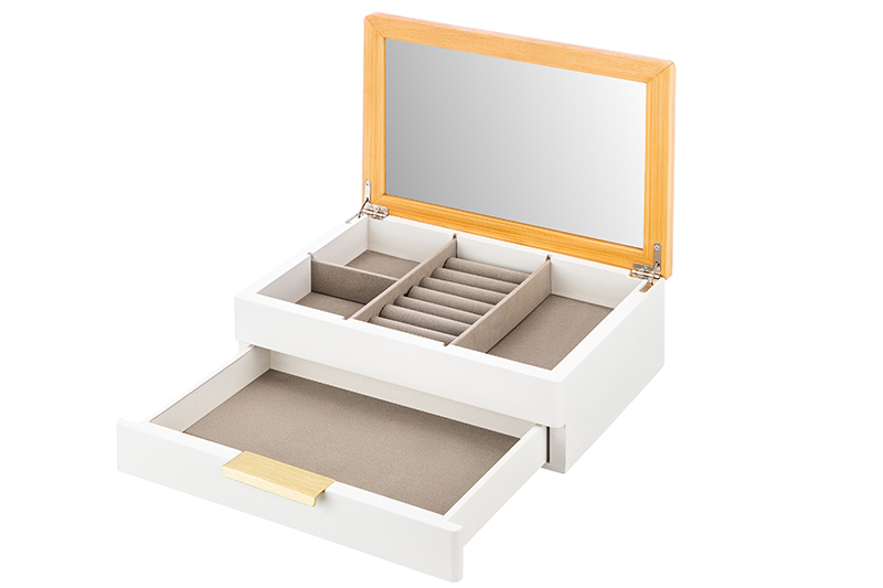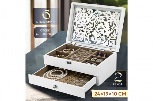 Шкатулка для украшений от Elan Gallery послужит универсальным органайзером для ювелирных изделий и бижутерии. Общий размер изделия – 26х18,5х8,5 см. Состоит из двух ярусов и откидной бамбуковой крышки. Верхний ярус включает два маленьких отделения, одно большое, и один специальный отсек для колец. Нижний ярус представляет собой выдвижной ящичек свободного назначения. На внутренней стороне крышки расположено зеркало размером 22х14 см. Эстетичная коробочка белого цвета поможет навести порядок даже в богатой коллекции драгоценностей! Прочные разделители помогут сортировать аксессуары удобным для вас способом: по типу изделия, цвету или материалу. Разложите по отсекам кулоны, колье или цепочки из золота, серебра и других металлов. Отделение для колец также можно использовать для хранения серёг-колец или серёжек-гвоздиков. Заполните вместительный нижний ярус браслетами или наручными часами, а также декоративными изделиями, контейнерами с бусинами, швейными принадлежностями или любыми другими вещами. Такая шкатулка станет оригинальным подарком как для девочки-подростка, так и для женщины. Подарите её маме, бабушке или подруге, чтобы порадовать их стильным и практичным дополнением хозяйственного инвентаря. Нежный и эстетичный дизайн гармонично впишет изделие в любой интерьер, позволяя хранить коробку даже на открытой полке. Это особенно удобно для тех, кто пользуется украшениями ежедневно. Поставляется в прочной картонной упаковке. В коллекции бренда Элан Галерея вы найдет большой ассортимент товаров для дома, которые помогут вам организовать бережную систему хранения ваших вещей!