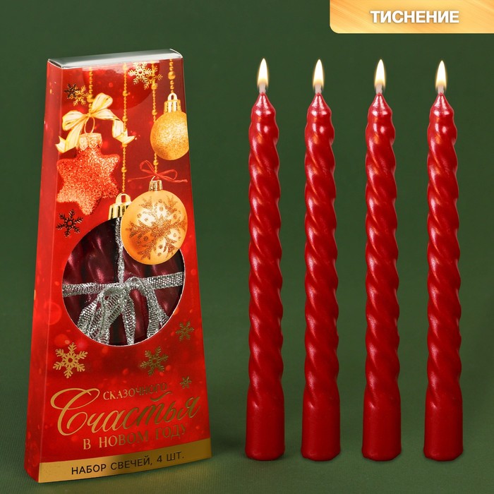 Подарочный набор витых античных свечей (4 шт., размер одной свечи составляет 1,5 х 1,5 х 15 см.) поможет украсить не только сервировку праздничного стола и оформление дома, но и отлично подойдет в качестве дополнения к подарку родным и друзьям, ведь свечи надежно упакованы в подарочную коробку с эксклюзивным дизайном (7 х 1,8 х 15,5 см).