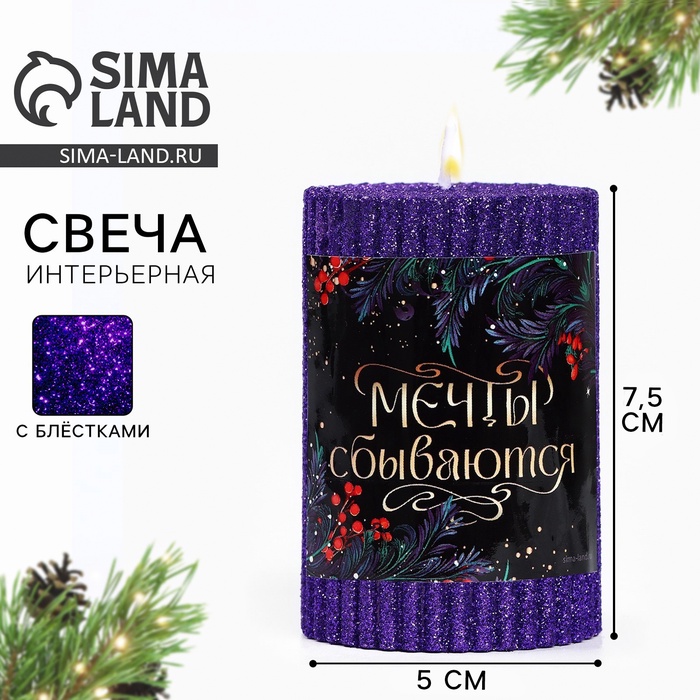 Свеча новогодняя «Мечты сбываются», столбик с блестками, 8.5×6 см