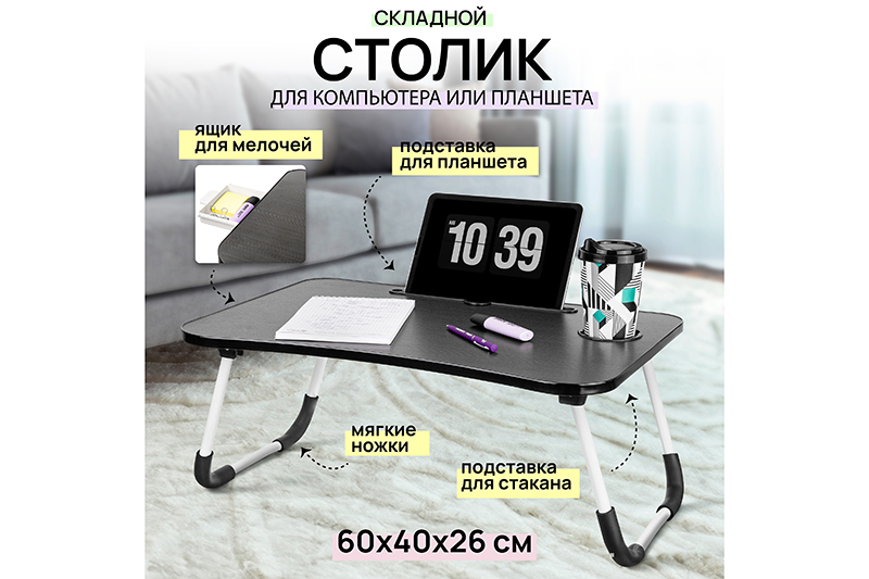 Складной столик для компьютера от ELCASA предназначен для комфортной работы с ноутбуком или другой портативной цифровой техникой. Общий размер изделия – 60х40х26 см. Лаконичный чёрный цвет и минималистичный дизайн органично впишут его в интерьер любой комнаты. Столешница выполнена из МДФ и оснащена пластиковыми вставками, её размер – 60х40х1,4 см. Максимальная нагрузка – 10 кг. В её поверхность встроены подставка для стакана, подставка для планшета и выдвижной ящик. Он подходит для хранения канцелярских принадлежностей и разнообразных мелочей. В большой подставке имеются два отверстия для проводов и зарядных устройств. Металлические ножки оборудованы мягкими противоскользящими накладками, которые обеспечивают устойчивость изделия на любой поверхности. Расстояние между ножками в разложенном виде – 64 см. Используйте столик на кровати, диване или в кресле – он подойдёт для любого пространства. Поставьте на него угощения, чтобы провести приятный вечер за просмотром любимого фильма или красиво сервировать завтрак в постель. Послужит в качестве письменной, книжной или журнальной поверхности. Его устойчивость сделает процесс письма удобным. Складная конструкция обеспечит компактное хранение изделия. Поставляется в дизайнерской картонной коробке – благодаря ей вам не понадобится дополнительная подарочная упаковка. Складной столик от бренда ЭЛЬКАСА станет незаменимым аксессуаром, который добавит комфорта как рабочему процессу, так и отдыху! /