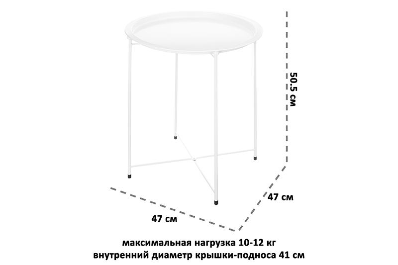Столик журнальный ELCASA "Белый" со съёмной крышкой-подносом (размер столика 47х47х50,5 см, размер крышки 47х47х2,3 см, внутренний диаметр крышки-подноса 41 см) отлично впишется в любой современный интерьер, от скандинавского до лофт. Круглый стол белого цвета изготовлен из металла, выдерживает нагрузку до 12 кг. Крышка снимается и может использоваться отдельно как поднос для подачи завтрака в кровать. Бортики по краям придают ему элегантности и позволяют устойчиво разместить посуду. Наслаждайтесь ароматным кофе и крепким чаем прямо в постели! Сервировочный столик подойдет так же для проведения уютных вечеров с бокалом вина или кружкой чая. Идеальное сочетание элегантности и функциональности сделает небольшой стол незаменимым элементом декора вашей комнаты, кухни, спальни и даже балкона. Компактный столик легко поднять, что позволяет перемещать его из комнаты в коридор или прихожую. Можно использовать как прикроватную тумбочку или поставить в рабочий кабинет. Столик-трансформер, выполненный в стильном дизайне, позволит держать все необходимые мелочи под рукой. Благодаря прикроватной высоте стола на нем удобно размещать книги, часы, мобильный телефон и другие принадлежности. В ванной женщины могут хранить на маленьком столике косметику и хозяйственный инвентарь. В комнате удобно использовать его как журнальный или косметический столик. Можно украсить стол вазой с цветами, что добавит уюта в интерьер вашего дома или офиса. Используйте многофункциональный столик для сервировки сэндвичей на террасе загородного дома или пикнике. Не рекомендуется применять абразивные моющие средства. Подойдет в подарок как мужчинам, так и женщинам. Универсальный столик поможет добавить уюта в офисный или домашний интерьер и будет незаменим для размещения журналов, книг, чашек с чаем и цветов!
