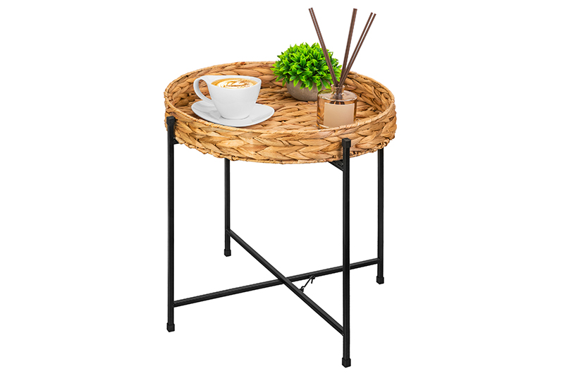 Складной журнальный столик 50х50х51 см от бренда ELCASA добавит природной гармонии домашнему интерьеру и позволит создать уютный уголок в квартире или на даче. Подойдёт в роли кофейного, балконного или для украшения любого пространства в доме. Размер столешницы 47х47х7 см, её внутренний диаметр – 42 см. Поверхность стола представляет собой прочное плетение из сушёных стеблей и листьев водного гиацинта. Это экологичный материал, устойчивый к выгоранию на солнце. Ножки выполнены из металла с пудровым покрытием. Благодаря прочному металлическому каркасу мебель имеет надежную конструкцию и выдерживает нагрузку до 15 кг. Столешница круглой формы съёмная, её можно использовать отдельно как сервировочный поднос для подачи чая, кофе или создания интерьерных композиций в комнате или на кухне. Она имеет бортики, что позволяет устойчиво разместить посуду, книги и любые другие предметы. Металлическую подставку можно компактно хранить за счёт складного механизма, если чайный столик не используется. При необходимости просто достаньте раскладной стол из шкафа, чтобы поставить на террасу, балкон или использовать как прикроватный для подачи завтрака в постель. Можно использовать в гостиной как приставной к дивану, разместив на нём напитки и закуски при просмотре фильма. В спальне подойдёт в качестве тумбы или туалетного столика под различные мелочи, косметику и предметы декора. Не рекомендуется применять абразивные моющие средства. Станет приятным подарком на любой праздник. Поставляется в красочной картонной коробке, поэтому не понадобится дополнительная подарочная упаковка, если вы решите сделать сюрприз своим близким. В коллекции бренда ELCASA представлено много товаров для дома со стильным дизайном, а также кухонного инвентаря и декоративных украшений. Добавьте природной эстетики домашнему интерьеру и используйте каждый сантиметр пространства с пользой!