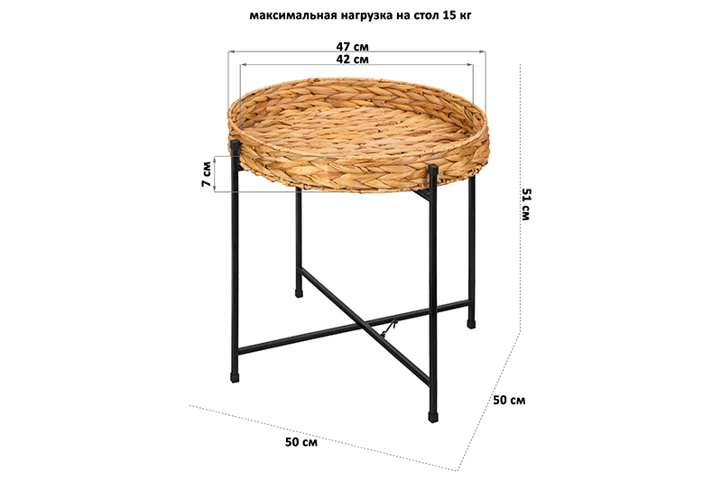 Столик журнальный 50*50*51 см складной со съемной столешницей из водного гиацинта, круглый