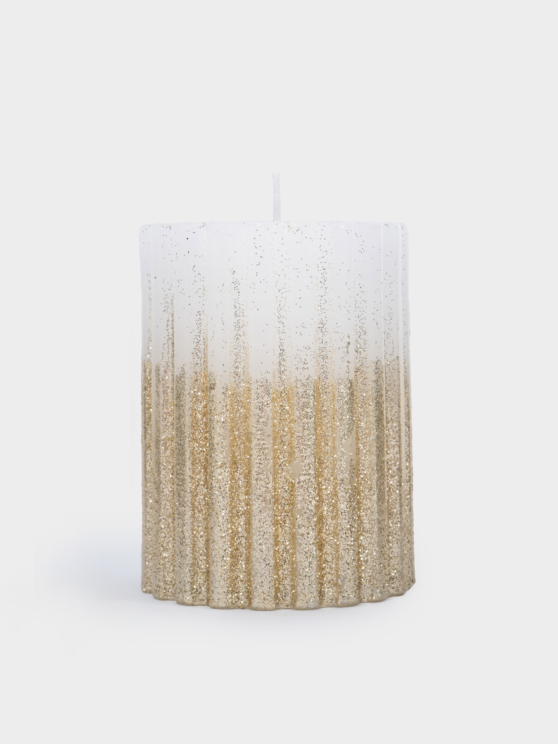 Свеча цилиндрическая. Размер: 7х10 см. Материал: парафин, блестки. Не зажигать вблизи легковоспламеняющихся поверхностей. Хранить в местах, недоступных для детей.