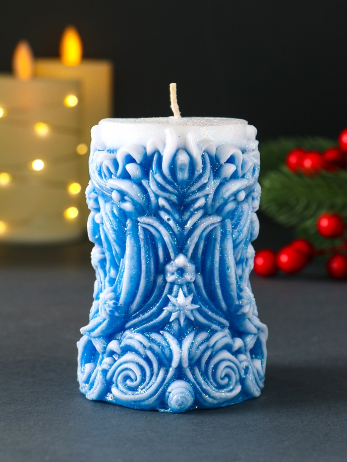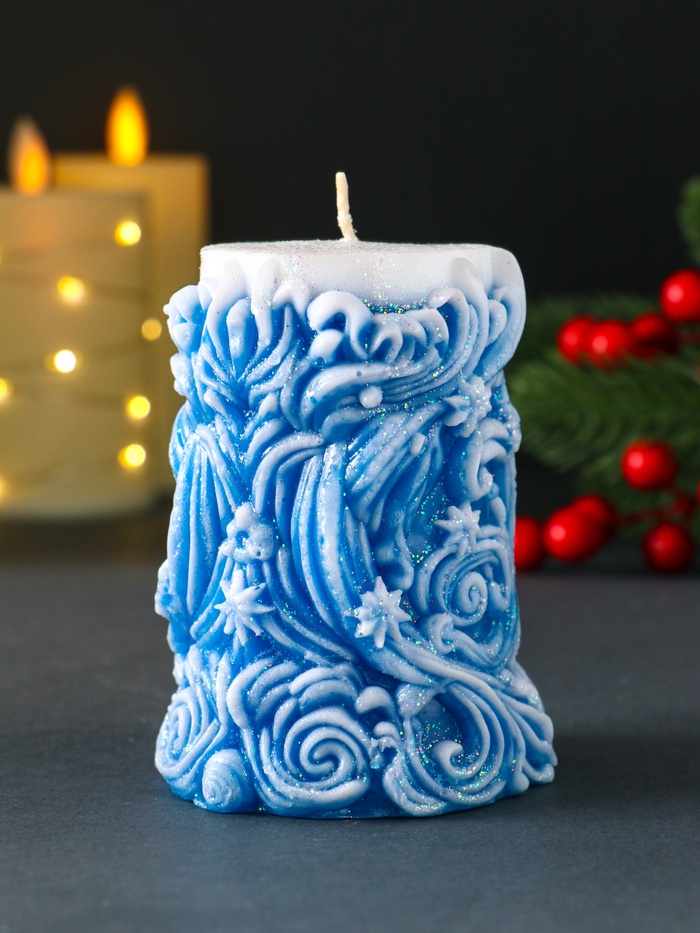 * Глубокий синий оттенок: Цвет зимнего неба или морской глади. Свеча гармонично впишется в холодную гамму новогоднего декора, создавая стильный акцент на столе или полке.