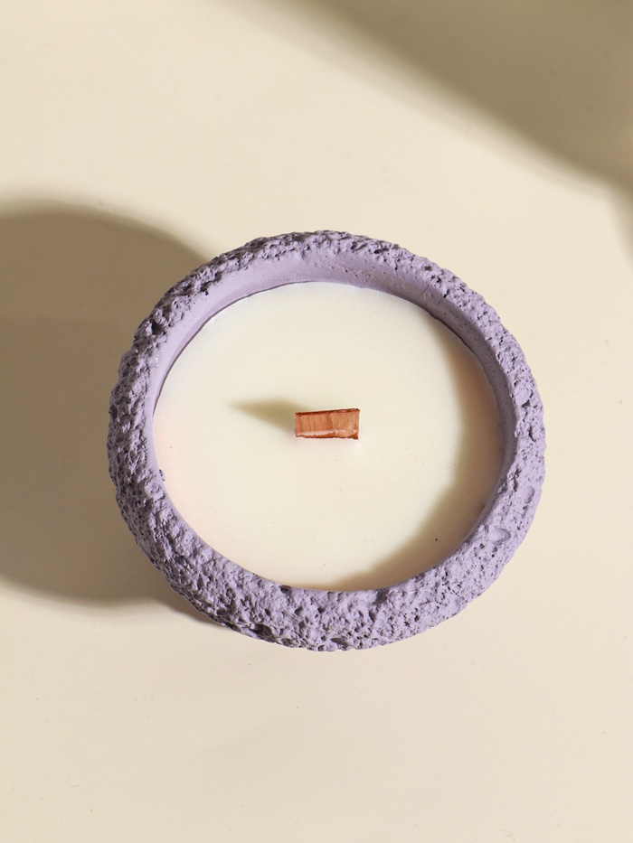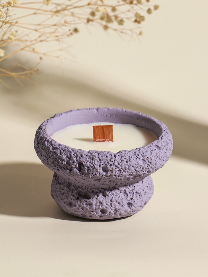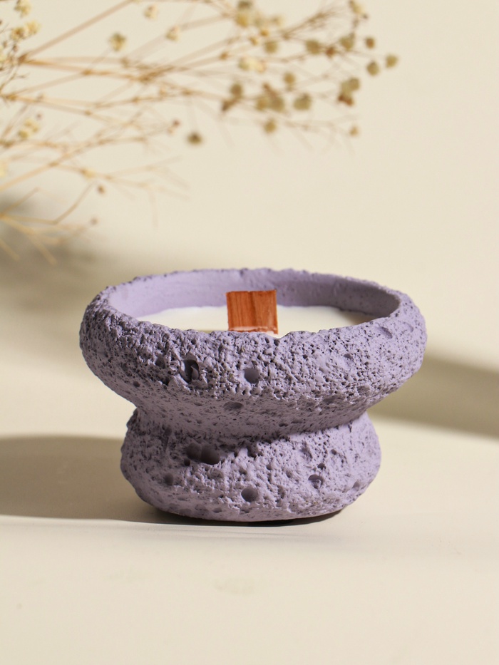 Эта сиреневая свеча в бетонном подсвечнике создаёт особенную атмосферу. Её мягкий, ровный свет и живое пламя от деревянного фитиля помогают замедлиться и настроиться на спокойный лад после напряжённого дня. Идеальный акцент для медитации или уединённого вечера.