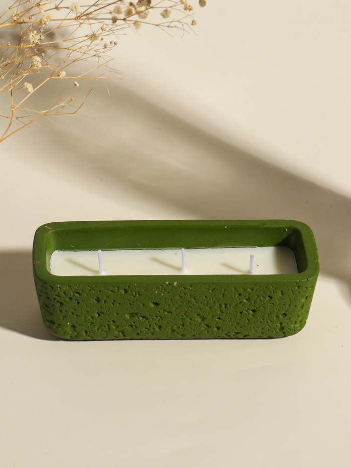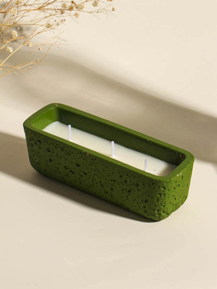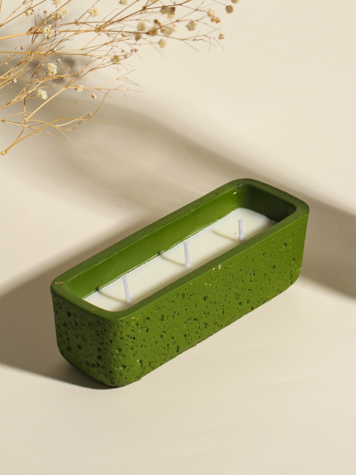 Эта зелёная свеча в бетонном подсвечнике — для тех, кто ценит спокойствие и долгие часы тишины. Три хлопковых фитиля горят долго и ровно, наполняя пространство мягким, живым светом без навязчивого аромата. Её строгий, тактильный дизайн создаёт атмосферу уединённости и стабильности, превращая простой ритуал в момент глубокой перезагрузки.