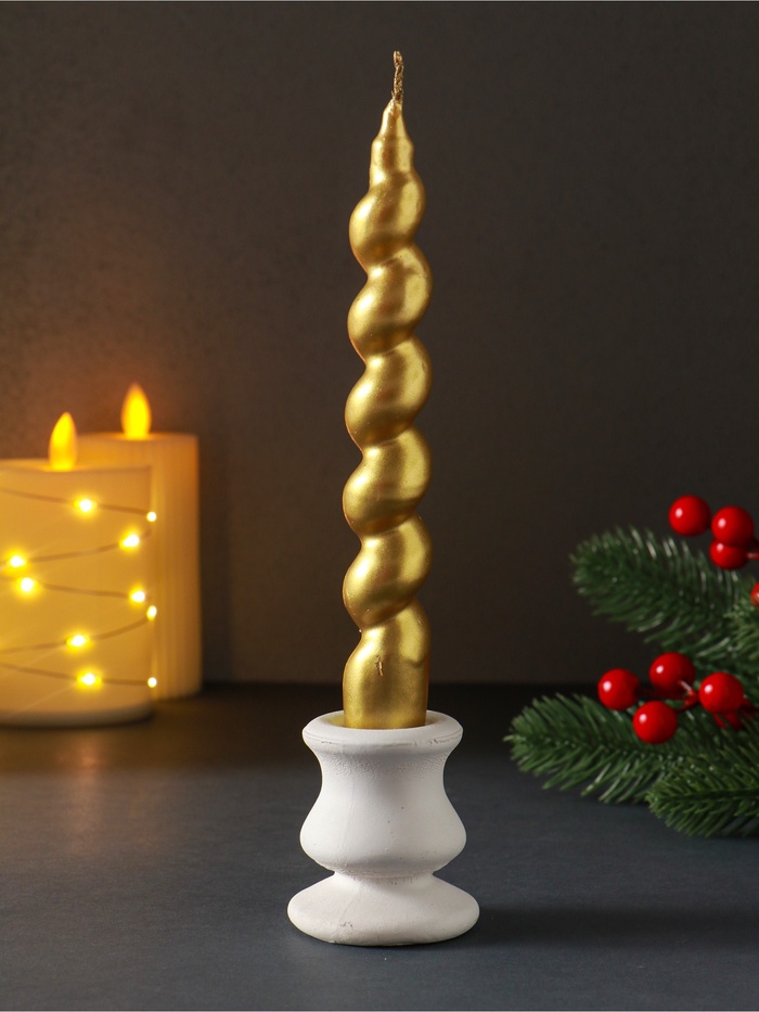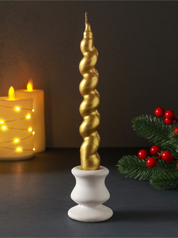 Эта золотая витая свеча — готовый акцент для торжественного интерьера. Её стройный силуэт и глубокая лакированная поверхность создают ощущение церемониальной элегантности даже до зажжения.