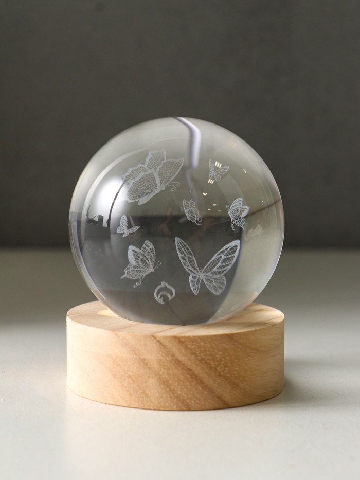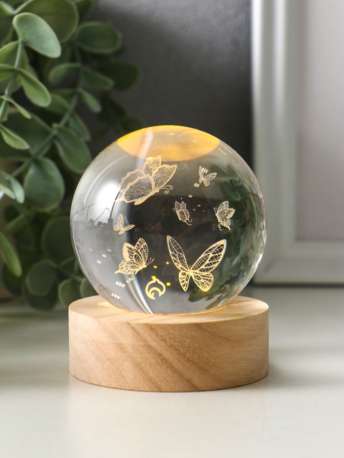 Световая фигурка стекло «Шар. Голограмма: Бабочки», d=6 см, подставка дерево, USB