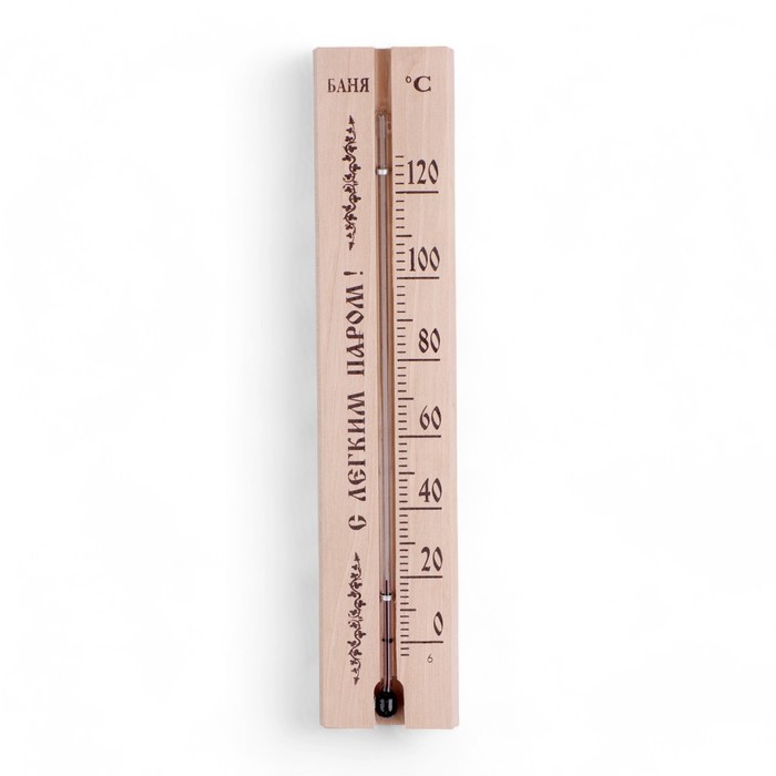 Термометр жидкостный, на деревянной основе. Размер термометра 22 х 4 х 1.4 см. Диапазон измерения: от 0 до +120 C. Цена деления шкалы, С: 2