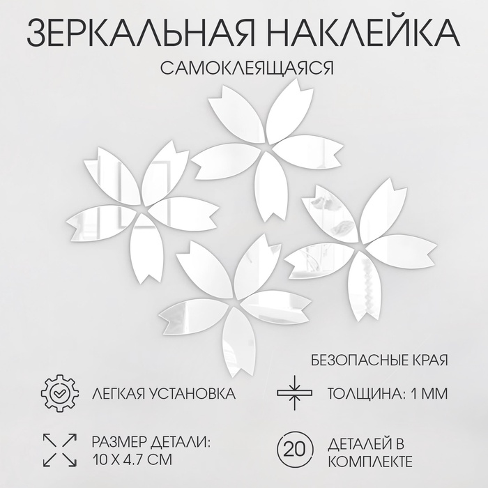 Наклейки изготовлены из высококачественного акрила. Это долговечный, безопасный, влагостойкий и неприхотливый в уходе материал. Наклейки подходят для декора интерьера дома, офиса, магазина. Их используют, чтобы освежить или дополнить интерьер, скрыть дефекты или в качестве безопасной и оригинальной альтернативы зеркалу.