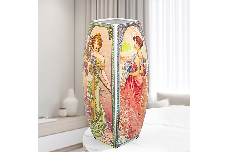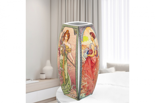 Настольная ваза Elan Gallery "Времена года" размером 11,5х11,5х25 см и объёмом 2 литра прямоугольной формы выполнена из фарфора нового поколения new bone china. Благодаря современным технологиям этот вид не уступает традиционному костяному фарфору в прочности, но гораздо экологичнее в производстве. В коллекции бренда Elan Gallery можно найти много красивой посуды и предметов декора с изображениями по мотивам шедевров мировой живописи! Высокая вазочка украшена репродукциями картин и панно чешского художника Альфонса Мухи. На каждой стороне фарфорового изделия изображены девушки, символизирующие лето, весну, зиму и осень. Яркий и узнаваемый сюжет удачно впишется в любой стиль интерьера, добавляя красоты и романтики. Интерьерная ваза подойдёт для размещения букетов, искусственных цветов или сухоцветов. Она послужит элементом декора вашего дома и поможет украсить его любыми растениями. Как красиво будут смотреться букеты из живых цветов и веточек на кухне и в любой комнате! Поставьте на видное место розы, тюльпаны или вербу для оформления интерьера в квартире. Интерьерная ваза украсит комнату даже без наполнения и подойдёт для создания декоративных композиций на журнальном столике или полке. Эргономичная форма позволит поставить в неё цветы с длинными стеблями. Не рекомендуется применять абразивные моющие средства. Поставляется в прочной красочной коробке. Станет шикарным подарком вашим близким на любой праздник. Благодаря стильной коробочке вам не понадобится дополнительная подарочная упаковка. Сделайте сюрприз ценителям искусства! Красивая фарфоровая ваза с рисунком станет украшением вашего дома и подчеркнёт красоту любого цветка. Ознакомьтесь с другими товарами для дома от Elan Gallery, здесь вы найдёте всё для создания домашнего уюта!
