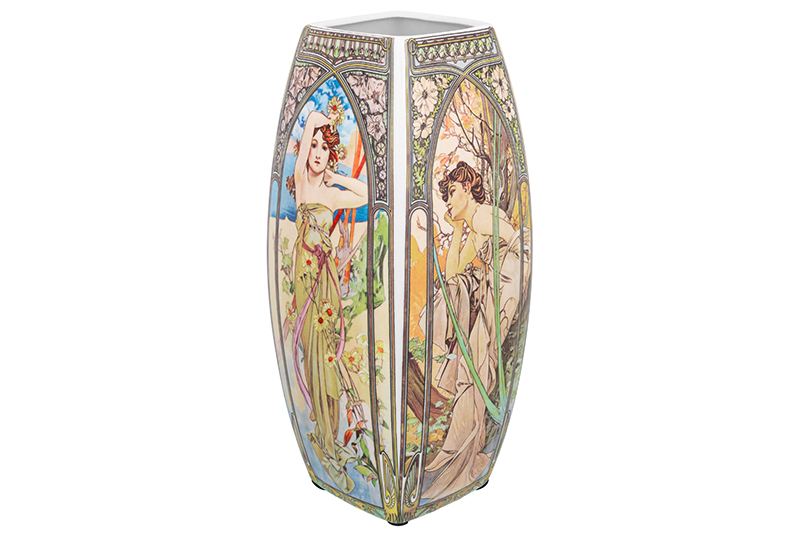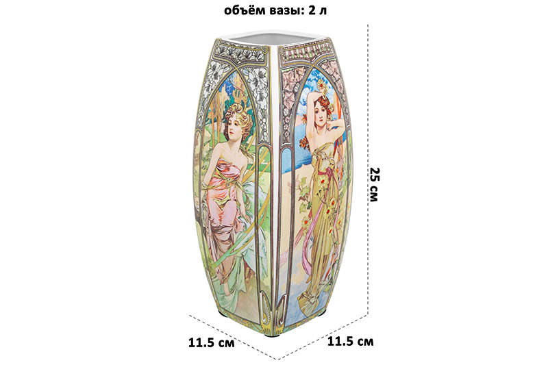 Настольная ваза Elan Gallery "Времена суток" размером 11,5х11,5х25 см и объёмом 2 литра прямоугольной формы выполнена из фарфора нового поколения new bone china. Благодаря современным технологиям этот вид не уступает традиционному костяному фарфору в прочности, но гораздо экологичнее в производстве. В коллекции бренда Elan Gallery можно найти много красивой посуды и предметов декора с изображениями по мотивам шедевров мировой живописи! Высокая вазочка украшена репродукциями картин и панно чешского художника Альфонса Мухи. На каждой стороне фарфорового изделия изображены девушки, символизирующие 4 времени суток. Яркий и узнаваемый сюжет удачно впишется в любой стиль интерьера, добавляя красоты и романтики. Интерьерная ваза подойдёт для размещения букетов, искусственных цветов или сухоцветов. Она послужит элементом декора вашего дома и поможет украсить его любыми растениями. Как красиво будут смотреться букеты из живых цветов и веточек на кухне и в любой комнате! Поставьте на видное место розы, тюльпаны или вербу для оформления интерьера в квартире. Интерьерная ваза украсит комнату даже без наполнения и подойдёт для создания декоративных композиций на журнальном столике или полке. Эргономичная форма позволит поставить в неё цветы с длинными стеблями. Не рекомендуется применять абразивные моющие средства. Поставляется в прочной красочной коробке. Станет шикарным подарком вашим близким на любой праздник. Благодаря стильной коробочке вам не понадобится дополнительная подарочная упаковка. Сделайте сюрприз ценителям искусства! Красивая фарфоровая ваза с рисунком станет украшением вашего дома и подчеркнёт красоту любого цветка. Ознакомьтесь с другими товарами для дома от Elan Gallery, здесь вы найдёте всё для создания домашнего уюта!
