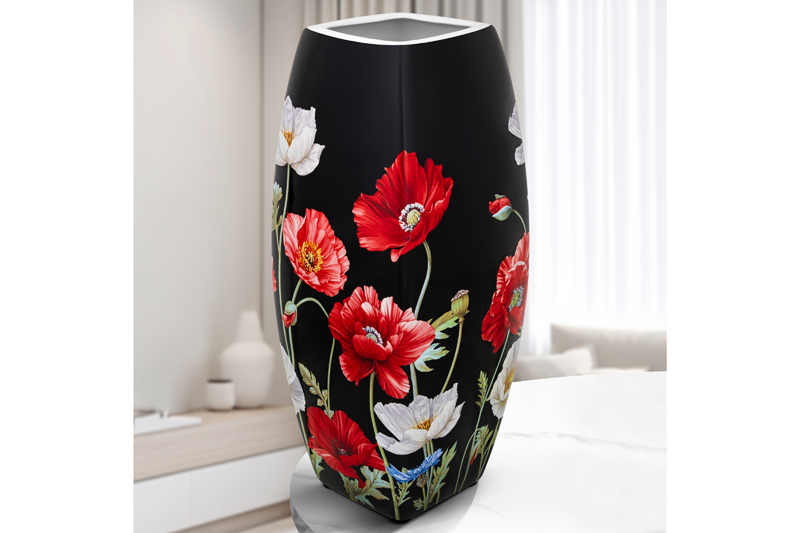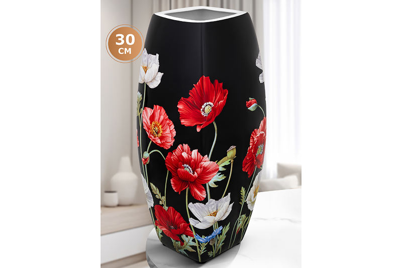 Настольная ваза Elan Gallery "Маки на чёрном" размером 12,5х12,5х30 см и объёмом 3 литра прямоугольной формы выполнена из фарфора нового поколения new bone china. New bone china сочетает в себе изящность и высокую прочность. От других видов костяного фарфора материал отличается большей экологичностью в производстве. Серия "Маки на чёрном" украшена красочным принтом с крупными цветами. Изображение красных и белых маков добавит ярких красок интерьеру. Имеет маленькие антискользящие накладки с обратной стороны дна для устойчивости на гладкой поверхности. Интерьерная вазочка подойдёт для размещения букетов, искусственных цветов или сухоцветов. Она послужит элементом декора вашего дома и поможет украсить его любыми растениями. Как красиво будут смотреться букеты из живых цветов и веточек на кухне и в любой комнате! Поставьте на видное место розы, тюльпаны или вербу для оформления интерьера в квартире. Ваза украсит комнату даже без наполнения и подойдёт для создания декоративных композиций на журнальном столике или полке. Эргономичная форма позволит поставить в неё цветы с длинными стеблями. Не рекомендуется применять абразивные моющие средства. Поставляется в красочной коробке. Станет приятным подарком на любой праздник. Благодаря стильной коробочке вам не понадобится дополнительная подарочная упаковка. Красивая фарфоровая ваза с рисунком станет украшением вашего дома и подчеркнёт красоту любого цветка. Ознакомьтесь с другими товарами для дома от Elan Gallery, здесь вы найдёте всё для создания уюта!