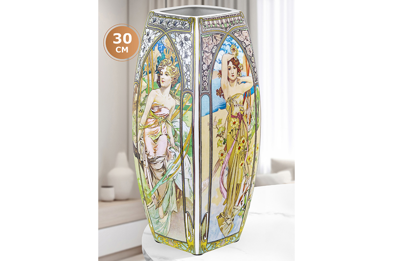 Настольная ваза Elan Gallery "Времена суток" размером 12,5х12,5х30 см и объёмом 3 литра прямоугольной формы выполнена из фарфора нового поколения new bone china. Благодаря современным технологиям этот вид не уступает традиционному костяному фарфору в прочности, но гораздо экологичнее в производстве. В коллекции бренда Elan Gallery можно найти много красивой посуды и предметов декора с изображениями по мотивам шедевров мировой живописи! Высокая вазочка украшена репродукциями картин и панно чешского художника Альфонса Мухи. На каждой стороне фарфорового изделия изображены девушки, символизирующие 4 времени суток. Яркий и узнаваемый сюжет удачно впишется в любой стиль интерьера, добавляя красоты и романтики. Интерьерная ваза подойдёт для размещения букетов, искусственных цветов или сухоцветов. Она послужит элементом декора вашего дома и поможет украсить его любыми растениями. Как красиво будут смотреться букеты из живых цветов и веточек на кухне и в любой комнате! Поставьте на видное место розы, тюльпаны или вербу для оформления интерьера в квартире. Интерьерная ваза украсит комнату даже без наполнения и подойдёт для создания декоративных композиций на журнальном столике или полке. Эргономичная форма позволит поставить в неё цветы с длинными стеблями. Не рекомендуется применять абразивные моющие средства. Поставляется в прочной красочной коробке. Благодаря стильной коробочке вам не понадобится дополнительная подарочная упаковка. Станет шикарным подарком вашим близким на любой праздник. Сделайте сюрприз ценителям искусства! Красивая фарфоровая ваза с рисунком станет украшением вашего дома и подчеркнёт красоту любого цветка. Ознакомьтесь с другими товарами для дома от Elan Gallery, здесь вы найдёте всё для создания домашнего уюта!