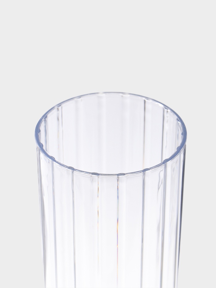 Строгий силуэт и игра света — основа современного интерьера. Прозрачная ваза с вертикальными полосами — это настольный акцент, где классическая форма встречается с выразительной текстурой. Рельефные линии преломляют свет, наполняя пространство динамикой и объёмом.