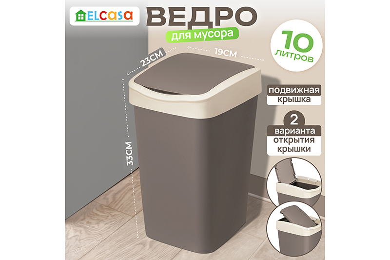Ведро для мусора с подвижной крышкой ELCASA размером 23,5х19,5х33,7 см и объёмом 10 литров поможет поддерживать чистоту в вашем доме, офисе или на улице. Размер дна 18,6x15 см. Мусорное ведро выполнено из полипропилена. Этот вид пластика считается наиболее безопасным, так как не содержит бисфенол А и не выделяет вредных веществ. Мусорное ведро прямоугольной формы шоколадного цвета с ободком в оттенке слоновая кость можно разместить в ванной комнате, туалете или на кухне. Поставьте урну из пластика на пол возле раковины, стола или в хозяйственный шкаф. Высокое пластиковое ведёрко можно использовать как офисное – под ненужные бумаги. Большая ёмкость обеспечивает достаточное пространство для хранения мусора любого вида. Можно приспособить на даче как уличную мусорку. Пластиковые мусорные вёдра выполнены в универсальном дизайне и хорошо сочетаются друг с другом. Можно использовать несколько баков из пластика для организации раздельной системы сбора мусора. Корзина для мусора с откидной крышкой станет незаменимым помощником для поддержания чистоты как в доме, так и на улице и поможет организовать порядок в любом пространстве. /