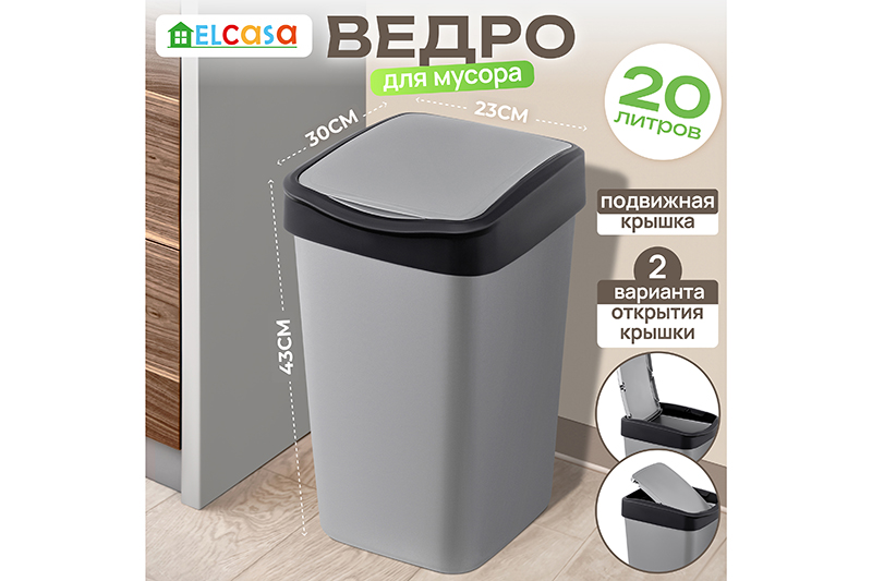 Ведро для мусора с подвижной крышкой ELCASA размером 30х23,5х43 см и объёмом 20 литров поможет поддерживать чистоту в вашем доме, офисе или на улице. Размер дна 23,6x18,2 см. Мусорное ведро выполнено из полипропилена. Этот вид пластика считается наиболее безопасным, так как не содержит бисфенол А и не выделяет вредных веществ. Мусорное ведро прямоугольной формы серого цвета с чёрным ободком можно разместить в ванной комнате, туалете или на кухне. Поставьте урну из пластика на пол возле раковины, стола или в хозяйственный шкаф. Высокое пластиковое ведёрко можно использовать как офисное – под ненужные бумаги. Большая ёмкость обеспечивает достаточное пространство для хранения мусора любого вида. Можно приспособить на даче как уличную мусорку. Пластиковые мусорные вёдра выполнены в универсальном дизайне и хорошо сочетаются друг с другом. Можно использовать несколько баков из пластика для организации раздельной системы сбора мусора. Корзина для мусора с откидной крышкой станет незаменимым помощником для поддержания чистоты как в доме, так и на улице и поможет организовать порядок в любом пространстве. /