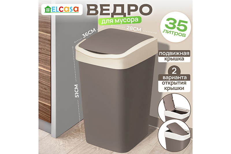 Ведро для мусора с подвижной крышкой ELCASA "Тандем" размером 36х28х51 см и объёмом 35 литров поможет поддерживать чистоту в вашем доме, офисе или на улице. Мусорное ведро выполнено из полипропилена. Этот вид пластика считается наиболее безопасным, так как не содержит бисфенол А и не выделяет вредных веществ. Мусорное ведро прямоугольной формы в шоколадном оттенке с ободком цвета слоновой кости можно разместить в ванной комнате, туалете или на кухне. Поставьте урну из пластика на пол возле раковины, стола или в хозяйственный шкаф. Высокое пластиковое ведёрко можно использовать как офисное – под ненужные бумаги. Большая ёмкость обеспечивает достаточное пространство для хранения мусора любого вида. Можно приспособить на даче как уличную мусорку. Пластиковые мусорные вёдра выполнены в универсальном дизайне и хорошо сочетаются друг с другом. Можно использовать несколько баков из пластика серии "Тандем" для организации раздельной системы сбора мусора. Корзина для мусора с откидной крышкой станет незаменимым помощником для поддержания чистоты как в доме, так и на улице и поможет организовать порядок в любом пространстве. /