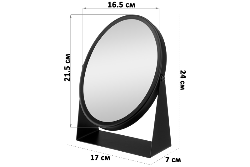 Двустороннее круглое зеркало имеет сторону со стандартным отражением и сторону с пятикратным увеличением. Общий размер изделия с подставкой – 17х7х24 см, размер зеркала – 21,5х16,5. Угол наклона регулируется, декоративное зеркальце вращается на 360 градусов. Элегантная чёрная подставка выполнена из пластика и оснащена нескользящей поверхностью. Увеличивающая сторона обеспечит удобство при проведении косметических процедур. Компактное настольное зеркальце станет функциональным аксессуаром и стильным дополнением интерьера вашего дома. Разместите его на туалетном столике или полке в своей спальне или ванной комнате. Поставьте на тумбочку рядом с косметическими принадлежностями, чтобы держать всё необходимое под рукой. Зеркальце станет помощником при ежедневном туалете, нанесении макияжа или масок для лица. Мужчинам подойдёт для бритья. Универсальный аксессуар станет удобным предметом инвентаря визажистов и гримёров. Не рекомендуется применять абразивные моющие средства. Поставляется в дизайнерской картонной коробке – благодаря ей вам не потребуется дополнительная подарочная упаковка. Крутящееся зеркало станет отличным подарком для женщин и мужчин, а универсальный дизайн впишет его в любой интерьер. Двустороннее зеркальце с увеличительной стороной станет стильным элементом декора для интерьера вашего дома и поможет поддерживать вашу красоту в течение дня!