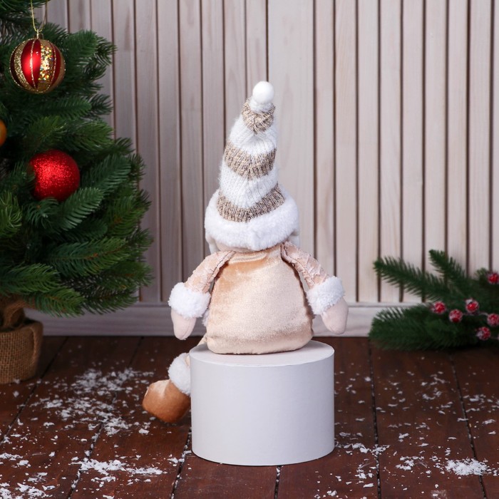 * Облачён в традиционный новогодний костюм с полосатым колпаком и ремешком, выполненным из золотистого материала, что придает образу особое праздничное сияние.