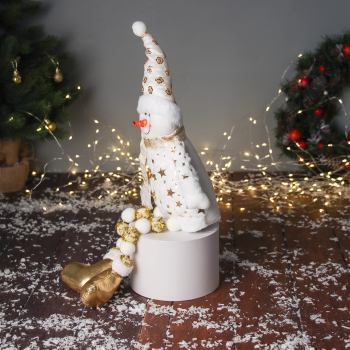 * Объемные части тела — мягконабивные, создающие выразительный образ снеговика с ногами и декоративным костюмом со звёздами.