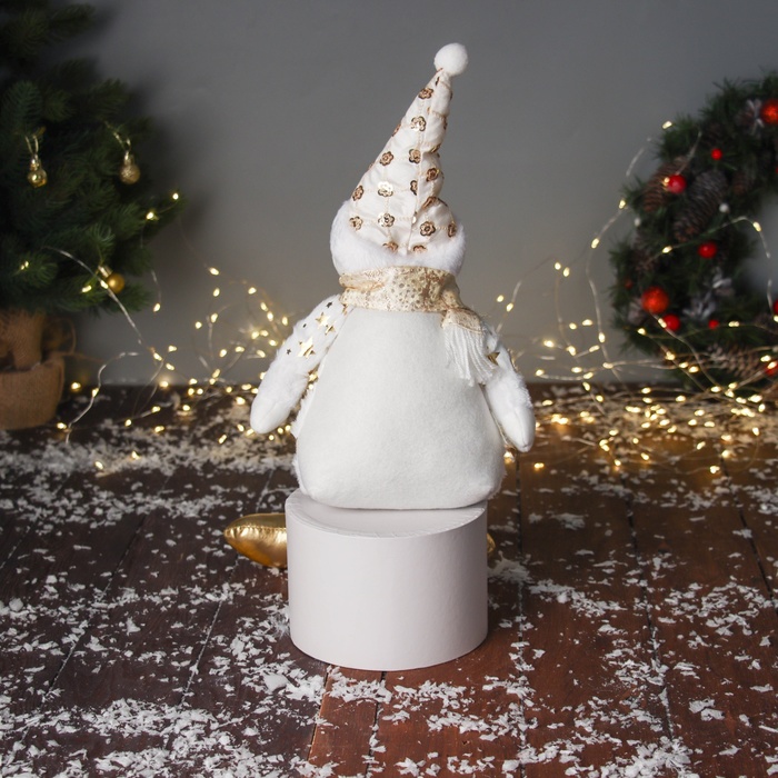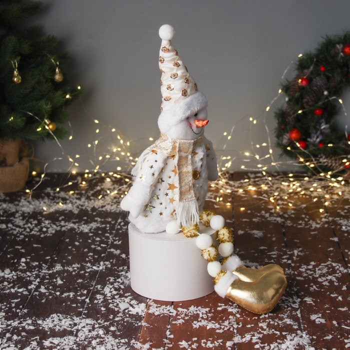 Эта мягкая игрушка добавит волшебства и уюта в любой дом во время новогодних праздников. Её размеры позволяют разместить её у камина, на полке или у входной двери. Золотисто-белый цвет и стильный дизайн создают атмосферу сказочного праздника. Такой снеговик станет не только декоративным элементом, но и любимой игрушкой для детей, наполняя дом атмосферой зимней сказки и новогоднего волшебства.