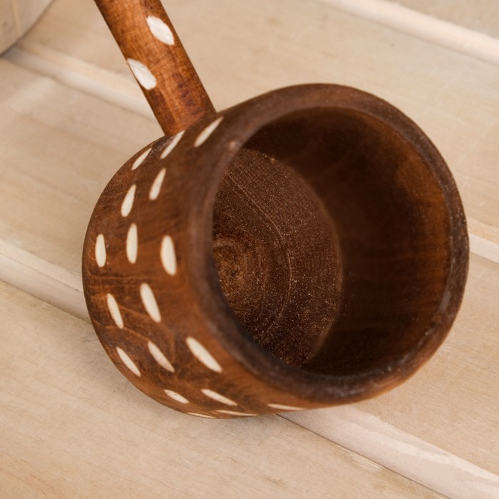 * Естественный материал – дерево: Этот материал не только практичен, но и безопасен. Деревянный черпак не нагревается так, как металлический, благодаря чему удобен в использовании даже в парной.