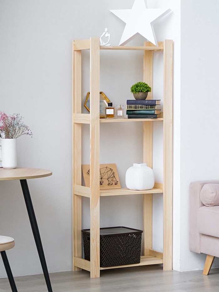 Деревянный стеллаж с 4 полками — это идеальное решение для хранения вещей дома или в офисе. Благодаря компактным размерам, стеллаж легко впишется в любое пространство и добавит естественный акцент вашему интерьеру.
