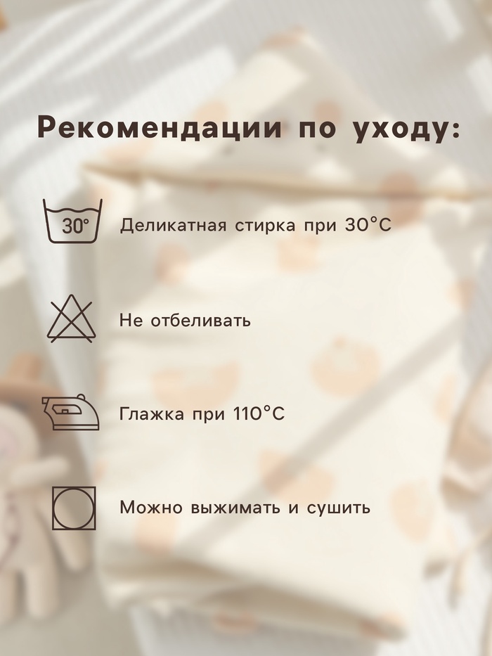 Рекомендации по уходу: Не отбеливать, Глажка при 150 °С, Барабанная сушка при низкой температуре, Стирка при 40 °С