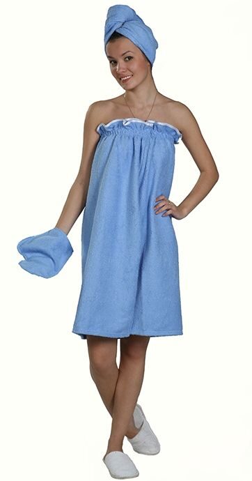 Комплект женский для бани и сауны ГОЛУБОЙ махровый 3 пр. (накидка-парэо, чалма, рукавица) хлопок 100%