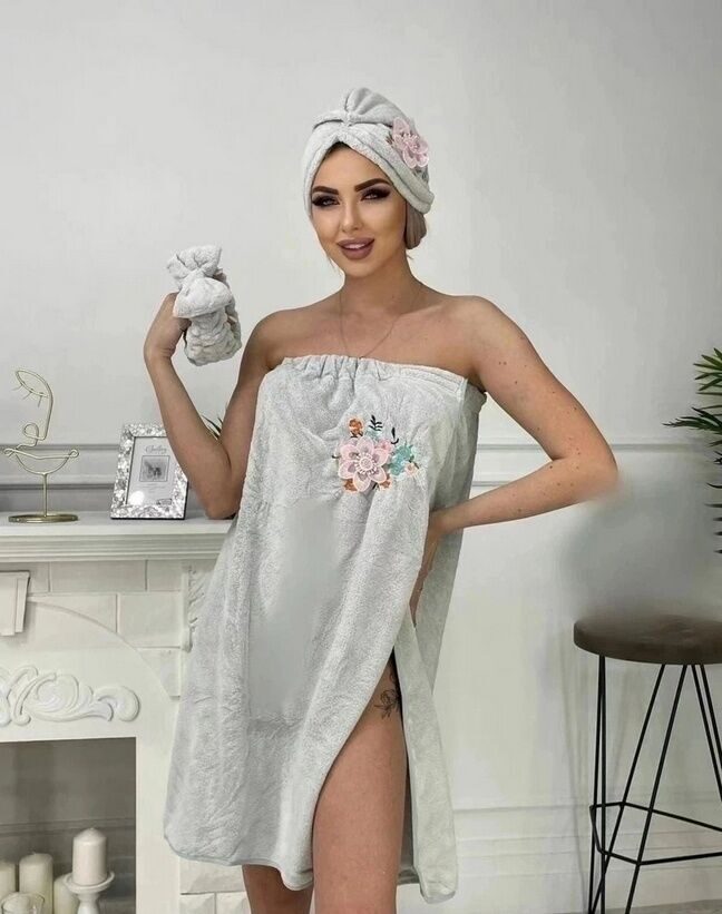 Комплект женский для бани и сауны "Кокетка"-СЕРЫЙ микрофибра 3 пр. (парео + чалма+повязка на голову))