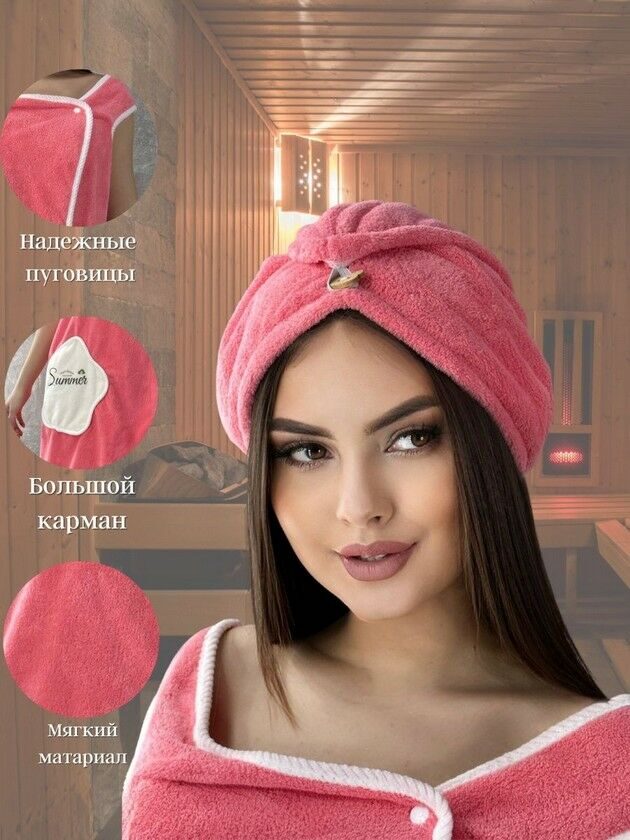 Комплект женский для бани и сауны "Красотка"-КОРАЛЛ микрофибра 2 пр. (парэо + чалма)