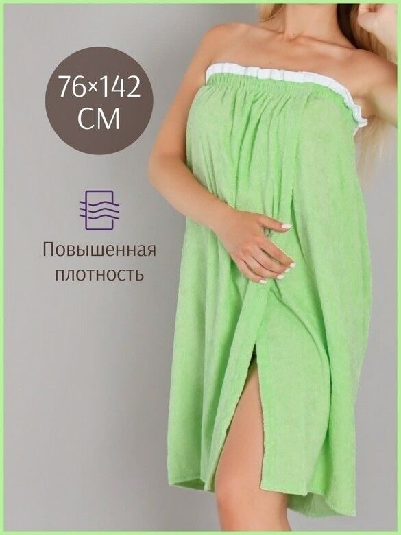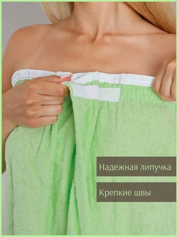 Махровое парео для бани – это удобная и стильная альтернатива полотенцу или простыне. Оно позволяет быстро обернуть тело мягкой тканью с нежным ворсом и надежно зафиксировать ее липучкой. Модель изготовлена из 100% хлопка. Парео очень качественное: оно отлично впитывает влагу, не линяет при стирке в горячей воде, долговечно. Волнообразный верхний край, украшенный декоративным кантом, придает модели нарядный, женственный и кокетливый вид.