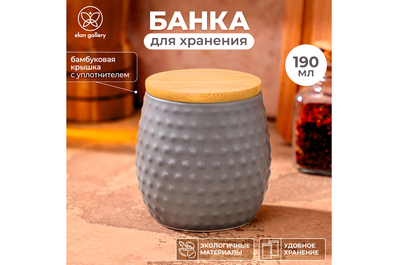 Банка из серии «Пузырьки» от Elan Gallery предназначена для организации хранения продуктов на вашей кухне. Размер ёмкости – 7,2х7,2х7,5 см, объём – 190 мл. Выполнена из керамики и имеет серый цвет, поверхность украшена выпуклым рельефом. Крышка выполнена из натурального бамбука и оснащена силиконовым уплотнителем. Изделие отлично подойдёт для хранения небольшой порции сыпучих продуктов: сахара и соли, чая и кофе, приправ и специй. Храните в ней ягоды, орехи и сухофрукты. Заполните изделие несколькими леденцами или конфетами. Подайте к столу, чтобы идеально дополнить чайную сервировку! Герметичная деревянная крышечка защитит ваши продукты от попадания грязи и пыли. Коллекция из трёх баночек монохромных цветов впишется в любой интерьер и позволит организовать хранение даже на открытых полках. Не рекомендуется применять абразивные моющие средства. Не подходит для использования в микроволновой печи. Без бамбуковой крышки подходит для посудомоечной машины. Бамбук нельзя замачивать! Поставляется в дизайнерской картонной коробке – благодаря ей вам не потребуется дополнительная подарочная упаковка. Это идеальный подарок для хозяйки, ценящей не только практичность, но и стиль. В ассортименте бренда Элан Галерея представлены банки для хранения на любой вкус. Соберите целый набор кухонных контейнеров для эстетичного хранения продуктов на вашей кухне!