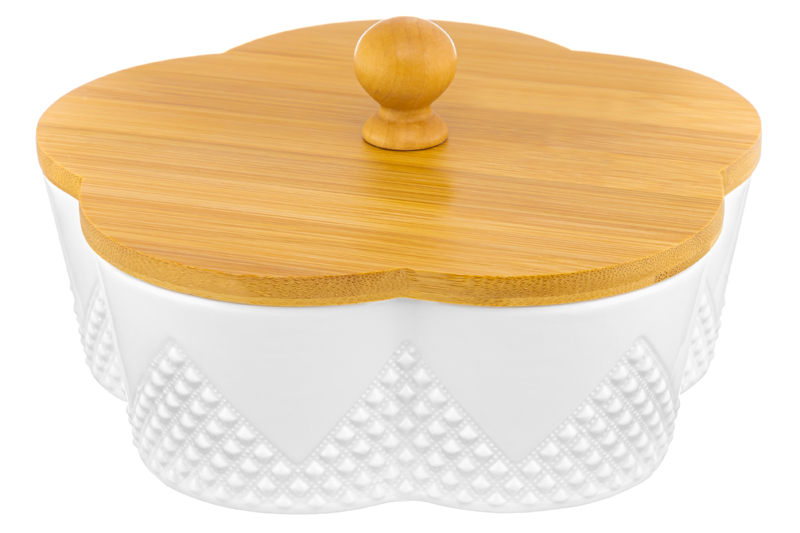 Банка для печенья из серии «Ромбики» предназначена для эстетичной сервировки вашего стола. Размер изделия – 19,5х19,5х10 см, объём – 900 мл. Выполнена из высококачественного белого фарфора в форме цветка и украшена рельефным геометрическим узором. Крышка выполнена из натурального бамбука. Фарфор легко отмывается и не впитывает цвет продуктов, благодаря чему надолго сохранит свою белизну. Красивая ёмкость станет не только функциональным, но и эстетичным дополнением вашего кухонного инвентаря. Наполните баночку любимым печеньем: бисквитным, сахарным или творожным. Послужит в качестве конфетницы: сложите в неё конфеты, шоколад, маленькие пирожные, пряники или любые другие сладости и выпечку. Наполните десертную вазочку большой порцией мороженного или разными десертами, чтобы разделить угощение с семьёй или друзьями. Используйте для подачи закусок: ягод, орехов, кусочков сыра или фруктов. Заполните дольками лимона, чтобы добавлять их в чай. Подойдёт для хранения сыпучих продуктов: кофе, сахара и соли, специй и приправ. Компактный контейнер удобно хранить в шкафчиках и на полках. Крышка сервировочной баночки имеет свободную посадку, чтобы вы могли легко и быстро открывать её. Она достаточно герметична, чтобы обеспечить сохранность продуктов. Благодаря стильному и лаконичному дизайну изделие гармонично впишется в интерьер любой кухни. Не рекомендуется применять абразивные моющие средства. Без бамбуковой крышки подходит для использования в посудомоечной машине и микроволновой печи. Бамбук нельзя замачивать. Поставляется в дизайнерской картонной коробке – благодаря ей вам не потребуется дополнительная подарочная упаковка. Посуда из серии «Ромбики» станет отличным подарком для хозяйки, ценящей не только практичность, но и стиль, и поможет собрать сервиз в едином стиле.