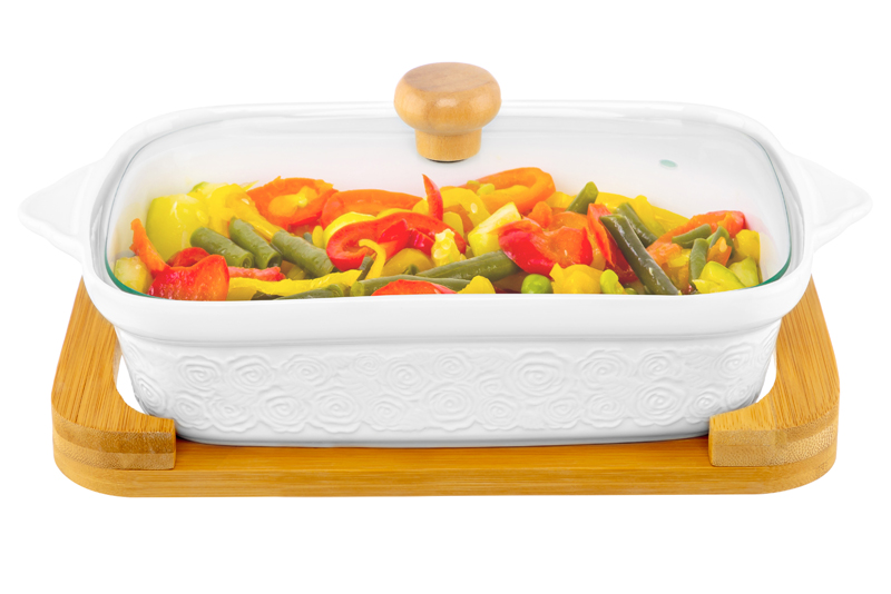 Блюдо из серии «Розы» от Elan Gallery предназначено для приготовления и эстетичной подачи ваших любимых блюд. Размер изделия – 30х18х13 см, объём – 1,1 литра. Внутренний размер блюда – 22,5х15,5 см. Выполнено из высококачественного белого фарфора. Он не впитывает цвет продуктов и легко отмывается, благодаря чему надолго сохраняет свою белизну. Поверхность изделия украшают рельефные узоры в виде пышных бутонов роз. Крышка выполнена из стекла, ручка на крышке и подставка выполнены из натурального бамбука. Изделие подойдёт для подачи сельди под шубой, салатов и плова. Используйте глубокую ёмкость в роли шубницы, чтобы порадовать гостей любимым праздничным блюдом. Послужит в качестве салатника или для подачи закусок из мяса и рыбы. Такая посуда поможет вам в приготовлении заливного и желе. Крышка поможет сохранить температуру блюд, а удобная деревянная ручка облегчит её снятие и не даст обжечься. Подставка защитит поверхности от воздействия высоких температур и послужит в качестве подноса для безопасной и комфортной подачи блюда к столу. Без крышки и подставки блюдо подойдёт для запекания бисквита и творожных запеканок. Изделие подойдёт для сервировки большого брикета мороженого, которое можно разделить с семьёй или друзьями. Не рекомендуется применять абразивные моющие средства. Без крышки и подставки подходит для использования в посудомоечной машине, микроволновой печи и духовом шкафу при температуре до 230 градусов. Бамбук нельзя замачивать! Поставляется в дизайнерской картонной коробке – благодаря ей вам не потребуется дополнительная подарочная упаковка. Фарфоровая сервировочная посуда будет оригинальным подарком для хозяйки, ценящей не только практичность, но и привлекательность. Серия «Розы» от бренда Элан Галерея станет украшением любого кухонного инвентаря и позволит собрать красивый сервиз в едином стиле! /