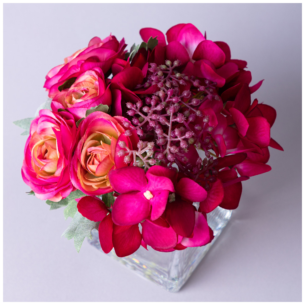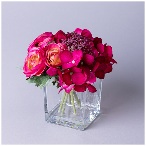 БУКЕТ ИСКУССТВЕННЫХ ЦВЕТОВ В КВАДРАТНОЙ ВАЗЕ ВЫСОТА= 16СМ (МАЛ=8ШТ./КОР=24ШТ.)