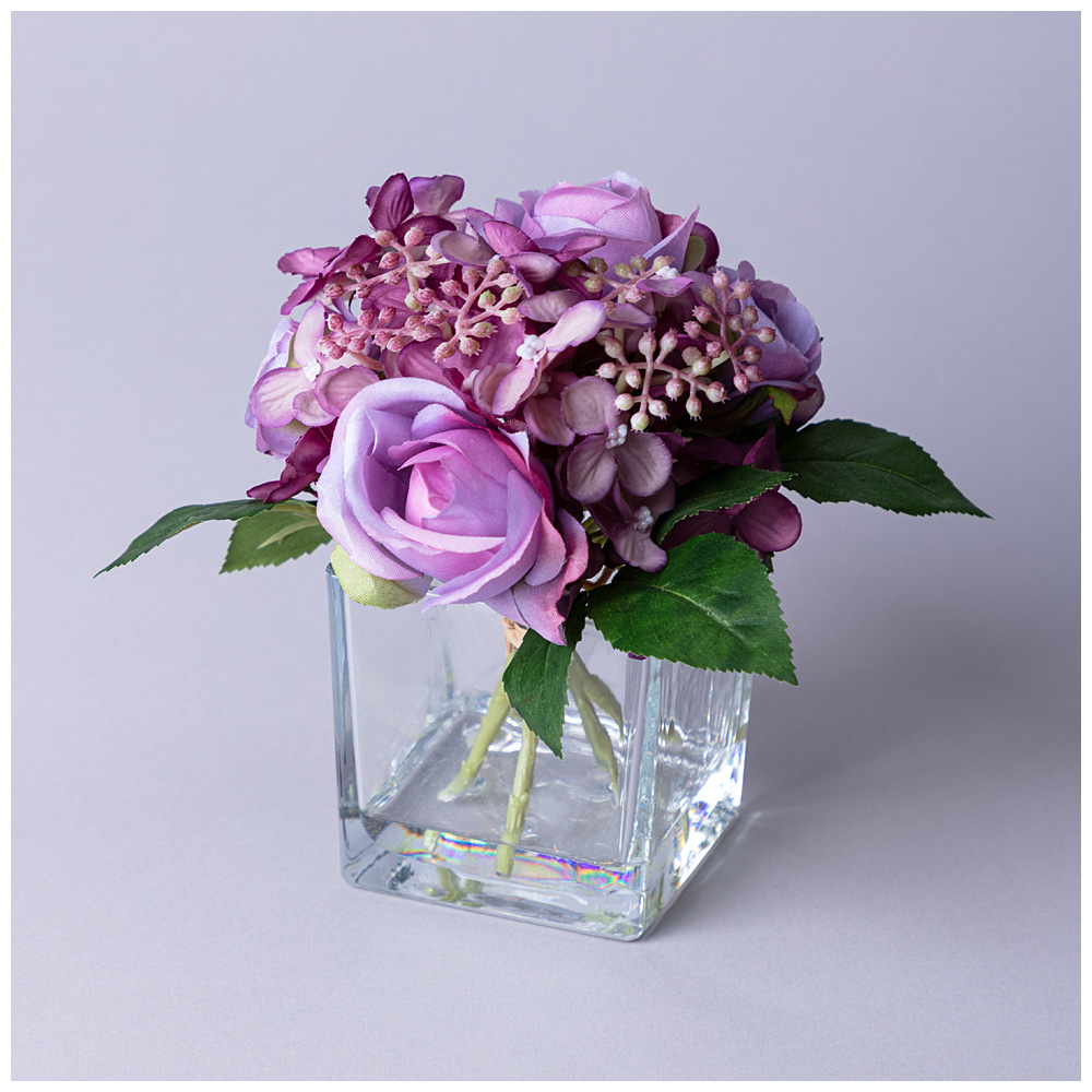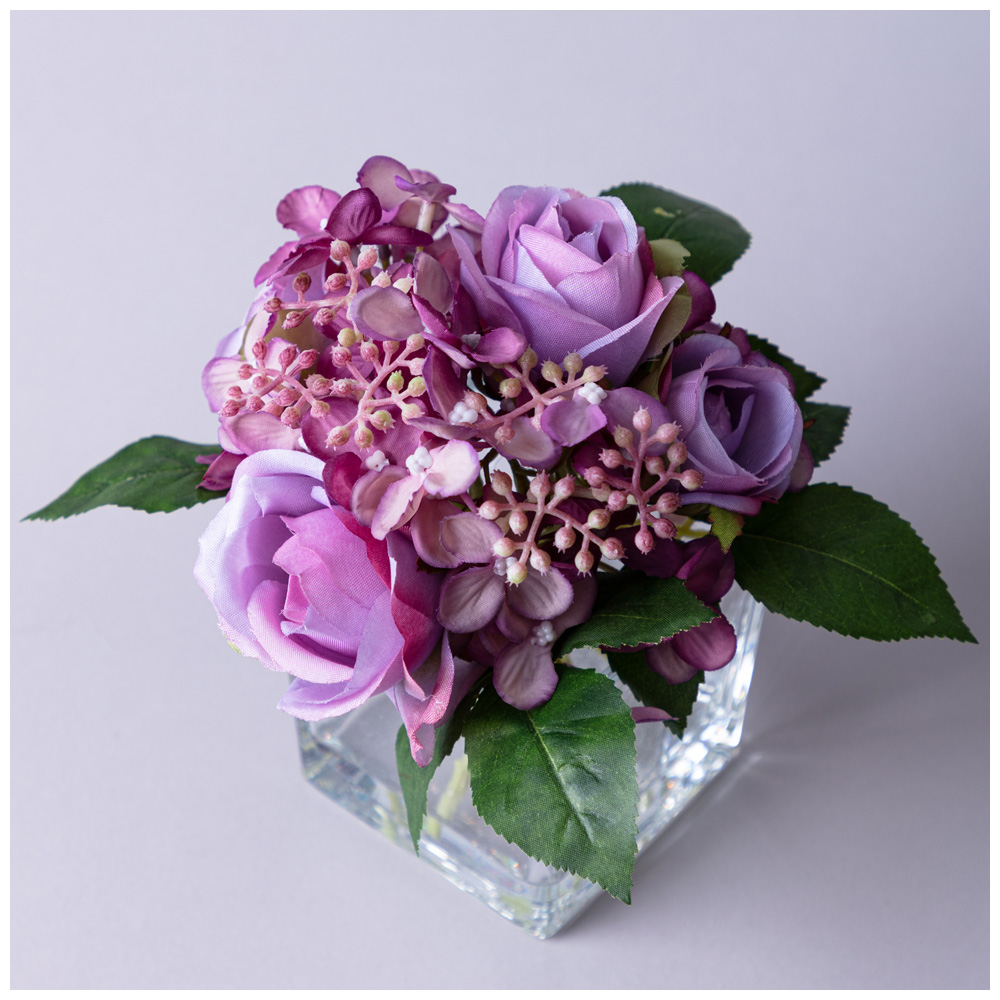 БУКЕТ ИСКУССТВЕННЫХ ЦВЕТОВ В КВАДРАТНОЙ ВАЗЕ ВЫСОТА= 16СМ (МАЛ=8ШТ./КОР=24ШТ.)