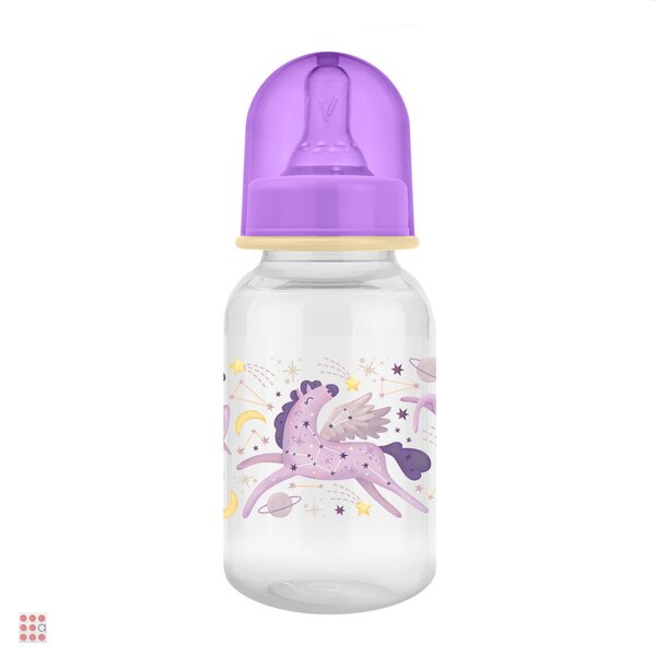 Бутылочка оснащена заглушкой, выпуклой мерной шкалой и колпачком, который защищает соску от пыли,