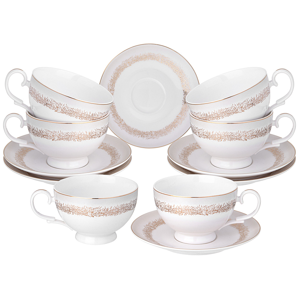 ТМ LEFARD Чайный набор "Золотой песок" для торжественых застолий и семейных обедов. Изысканный фарфор Bone Pocelain с эффектом костяного фафора, тонкий и полупрозрачный, прочный и никогда не темнеет. Утонченный кружевной рельефный орнамент выглядит объемным и привлекательным благодаря различной обработке выпуклых и базовых поверхностей. Изящная золотая обводка придает блеск и торжественность. Эта посуда замечательный подарок на свадьбу, юбилей, день рождения, который наверняка пригодится каждой семье, запомнится навсегда и прослужит долгие годы. Дизайнеры торговой марки предлагают чайный и обеденный сервизы и наборы тарелок и чайных пар, чтобы сформировать полную сервировку стола предметами коллекции на 6 или 12 персон.