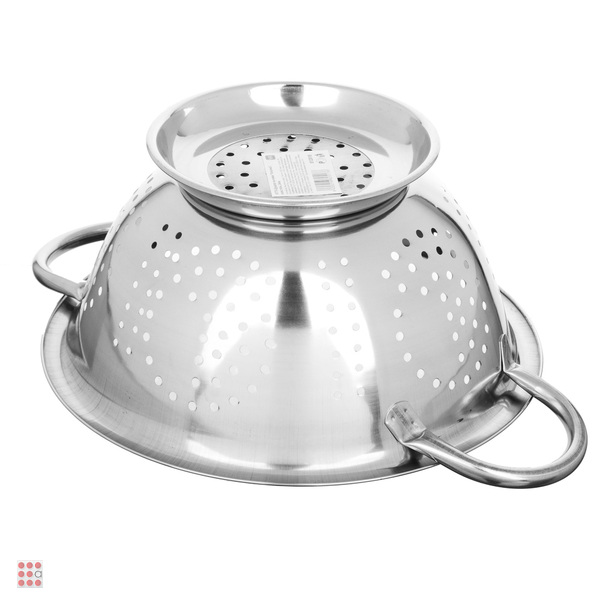 Дуршлаг диаметром 24 см из нержавеющей стали на ножке, с двумя "С" образными ручками.