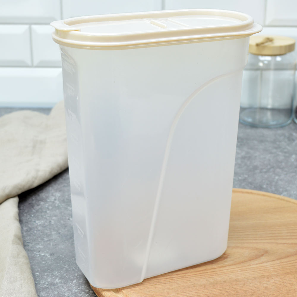 Емкость для сыпучих продуктов 2,4л (бежевый)Хранение и использование различных сыпучих продуктов становится очень комфортным благодаря овальной форме ёмкости, углублению на корпусе для удобного захвата и специальной крышке. Прозрачность ёмкости позволяет видеть содержимое, а мерная шкала – его количество.Крышка плотно прилегает к корпусу и защищает содержимое от проникновения влаги и жучков. Откидная часть крышки позволяет дозировано высыпать продукт из ёмкости. Матовое покрытие на углубленной части корпуса препятствует выскальзыванию ёмкости из рук.Объем - 2,4 л.Размер - 19х9,5х25 см.Заключаем договора по 44 ФЗ, 223 ФЗ