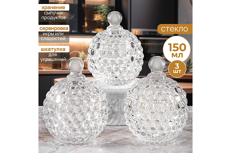 Набор 3 горшочков для мёда “Пузырьки” с крышками выполнен из стекла и украшен декоративными рельефными узорами. Размер каждого изделия – 8,5х8,5х11 см, объём – 150 мл. Высота каждого изделия без крышки – 5,2 см. Интересные прозрачные баночки подойдут для хранения мёда, варенья, сахара и соли. Можно использовать их как ёмкости для чая, кофе и других сыпучих продуктов. Декоративные баночки круглой формы станут гармоничным дополнением при сервировке вашего стола как в будни, так и на праздник. Красивый дизайн позволит использовать их не только для хранения продуктов, но и для подачи на стол. Положите в них конфеты или икру, чтобы удивить гостей изящной сервировкой. Стеклянные ёмкости с крышечками можно использовать не только как сахарницы, икорницы или соусники, но и для специй и приправ. Это позволит держать под рукой всё необходимое во время приготовления и приёма пищи. На даче медовницы будут незаменимыми для семейного чаепития, а также подойдут для подачи ягод. В качестве альтернативы красивые вазочки с крышками можно использовать как шкатулки. Сложите в них украшения и любые маленькие предметы. Не рекомендуется применять абразивные моющие средства. Не использовать в посудомоечной машине и микроволновой печи. Набор поставляется в стильной картонной упаковке. Красивая посуда – это отличный подарок на любой праздник. Набор медовых бочонков “Пузырьки” станет многофункциональным дополнением вашего кухонного инвентаря и настоящим украшением кухни!