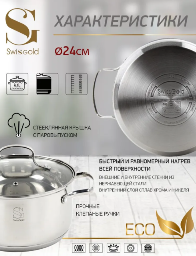 АКЦИЯ 1356р. 2100р.18078-1 Кастрюля с крышкой 6,1 л нерж/сталь "Swisgold" (х6)