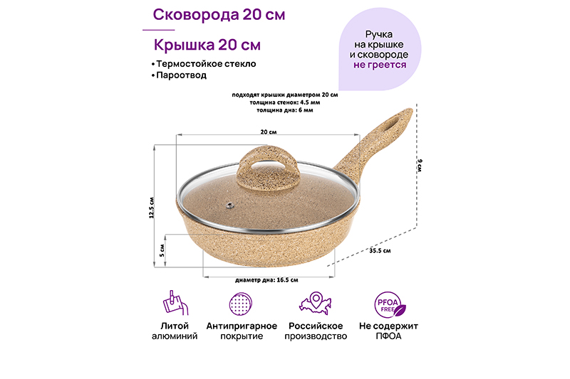 Сковорода глубокая 20 см ГАРМОНИЯ ВКУСА "Медовый гранит" С КРЫШКОЙ ф20, н/р, 35,5*21*12,5 см