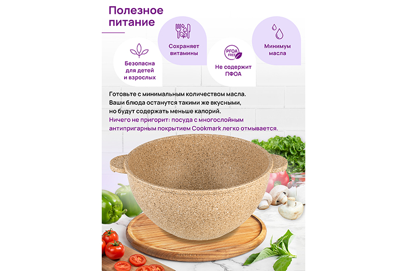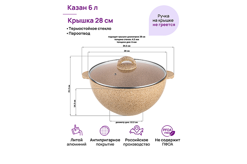 Казан Elan Gallery "Медовый гранит" из серии "Гармония вкуса" объёмом 6 литров с крышкой равномерно разогревается и распределяет тепло таким образом, что продукты в нем остаются сочными и сохраняют все свои полезные и вкусовые свойства. Диаметр крышки – 28 см, диаметр дна – 12,2 см. Выполнен в стильном дизайне, имитирующим гранит. Казан изготовлен из толстостенного литого алюминия и имеет ультрапрочное двухслойное антипригарное покрытие Cookmark. Покрытие устойчиво к царапинам и износу, полностью безопасно для здоровья и не содержит PFOA или других вредных веществ. Толстые стены и плотная крышка из жаропрочного стекла при нагреве создают эффект духовки. Пароотвод обеспечивает равномерную циркуляцию. Идеален для приготовления плова и других вкусных блюд из мяса и овощей. Такой казан – мечта любой хозяйки, с его помощью можно приготовить вкусную и полезную пищу. Эксплуатация: не нагревать без продуктов. Дайте посуде остыть, прежде чем помещать ее в воду. Использовать только деревянные и силиконовые приборы. Не мыть абразивными или щелочными моющими средствами. Использовать в посудомоечной машине только в режиме "Эко" с применением средств, не содержащих щелочи. Подходит для всех типов плит, кроме индукционных. Можно использовать в духовом шкафу без крышки при температуре до 250 градусов. Кухонный инвентарь в стильном дизайне станет отличным подарком для любой женщины. Подарите кухонные принадлежности из серии «Гармония вкуса» маме или бабушке, они точно оценят такой подарок. В серии "Гармония вкуса" вы найдёте сковороды, кастрюли, блинницы, казаны и жаровни. Соберите набор для вашей кухни в едином стиле!