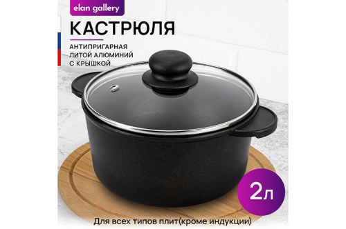 Кастрюля Elan Gallery "Чёрный оникс" из серии "Гармония вкуса" объёмом 2 литра с крышкой равномерно разогревается и распределяет тепло таким образом, что продукты в ней остаются сочными и сохраняют все полезные свойства и аромат. Диаметр стеклянной крышки – 18 см, диаметр дна – 17 см. Кастрюля с прозрачной крышкой выполнена из толстостенного литого алюминия и имеет ультрапрочное двухслойное антипригарное покрытие Cookmark. Покрытие устойчиво к царапинам и износу, полностью безопасно для здоровья и не содержит PFOA или других вредных веществ. Крышка изготовлена из жаропрочного стекла и имеет пароотвод. Алюминиевая кастрюлька с толстыми дном и стенками выполнена в стильном дизайне и позволит приготовить дома суп, кашу, плов или любой гарнир. Порадуйте близких супом с фрикадельками, борщом или куриной лапшой. Удобна для приготовления пасты, так как макаронные изделия не будут прилипать на дно благодаря антипригарной поверхности. Суповая кастрюля подойдёт для тушения и варки блюд из мяса, рыбы и овощей. Эксплуатация: кухонную утварь не нагревать без продуктов. Дайте посуде остыть, прежде чем помещать ее в воду. Использовать только деревянные и силиконовые приборы. Не мыть абразивными или щелочными моющими средствами. Использовать в ПММ только в режиме "Эко" с применением средств, не содержащих щелочи. Подходит для стеклокерамических, газовых и электрических плит. Не подходит для индукционных плит! Без крышки можно использовать в духовой печи при температуре до 250 градусов. Теперь для использования в духовке не понадобится отдельная ёмкость. Кастрюля станет идеальным подарком для женщин на 8 Марта или День Рождения и придаст процессу приготовления пищи новый уровень комфорта. Подарите такую универсальную вещь маме, подруге, сестре или бабушке. Красивая кастрюля – мечта любой хозяйки! В серии "Гармония вкуса" вы найдёте любой кухонный инвентарь: сковороды, кастрюли, блинницы, казаны и жаровни. Соберите набор для вашей кухни или столовой в едином стиле!