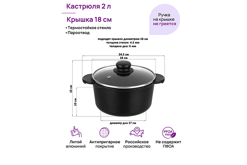 Кастрюля 2 л ГАРМОНИЯ ВКУСА "Черный Оникс" С КРЫШКОЙ ф18, 24,5*19*15 см