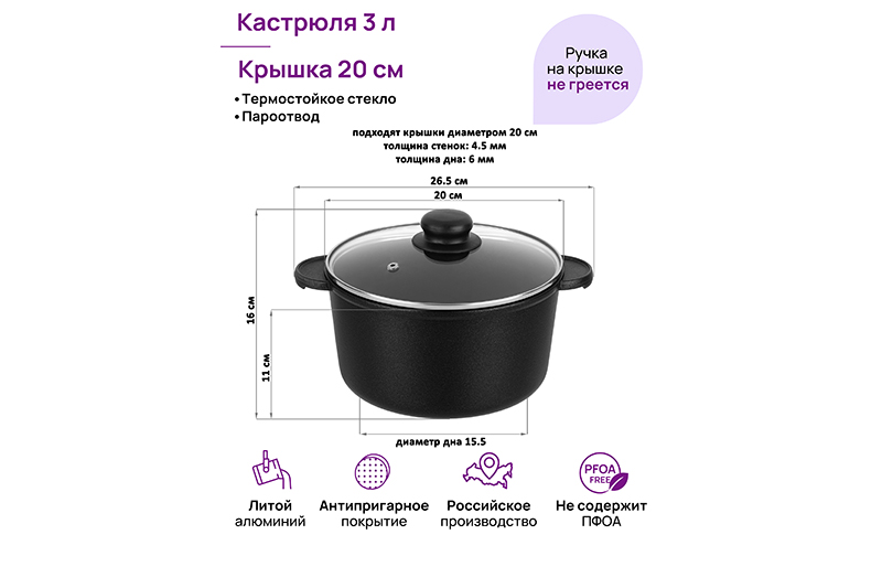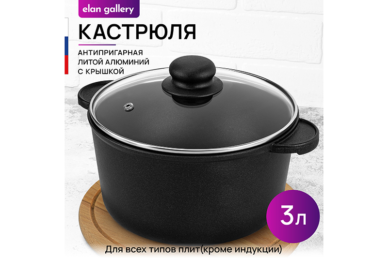 Кастрюля Elan Gallery "Чёрный оникс" из серии "Гармония вкуса" объёмом 3 литра с крышкой равномерно разогревается и распределяет тепло таким образом, что продукты в ней остаются сочными и сохраняют все полезные свойства и аромат. Диаметр стеклянной крышки – 20 см, диаметр дна – 15,5 см. Кастрюля с прозрачной крышкой выполнена из толстостенного литого алюминия и имеет ультрапрочное двухслойное антипригарное покрытие Cookmark. Покрытие устойчиво к царапинам и износу, полностью безопасно для здоровья и не содержит PFOA или других вредных веществ. Крышка изготовлена из жаропрочного стекла и имеет пароотвод. Алюминиевая кастрюлька с толстыми дном и стенками выполнена в стильном дизайне и позволит приготовить дома суп, кашу, плов или любой гарнир. Порадуйте близких супом с фрикадельками, борщом или куриной лапшой. Удобна для приготовления пасты, так как макаронные изделия не будут прилипать на дно благодаря антипригарной поверхности. Суповая кастрюля подойдёт для тушения и варки блюд из мяса, рыбы и овощей. Эксплуатация: кухонную утварь не нагревать без продуктов. Дайте посуде остыть, прежде чем помещать ее в воду. Использовать только деревянные и силиконовые приборы. Не мыть абразивными или щелочными моющими средствами. Использовать в ПММ только в режиме "Эко" с применением средств, не содержащих щелочи. Подходит для стеклокерамических, газовых и электрических плит. Не подходит для индукционных плит! Без крышки можно использовать в духовой печи при температуре до 250 градусов. Теперь для использования в духовке не понадобится отдельная ёмкость. Кастрюля станет идеальным подарком для женщин на 8 Марта или День Рождения и придаст процессу приготовления пищи новый уровень комфорта. Подарите такую универсальную вещь маме, подруге, сестре или бабушке. Красивая кастрюля – мечта любой хозяйки! В серии "Гармония вкуса" вы найдёте любой кухонный инвентарь: сковороды, кастрюли, блинницы, казаны и жаровни. Соберите набор для вашей кухни или столовой в едином стиле!